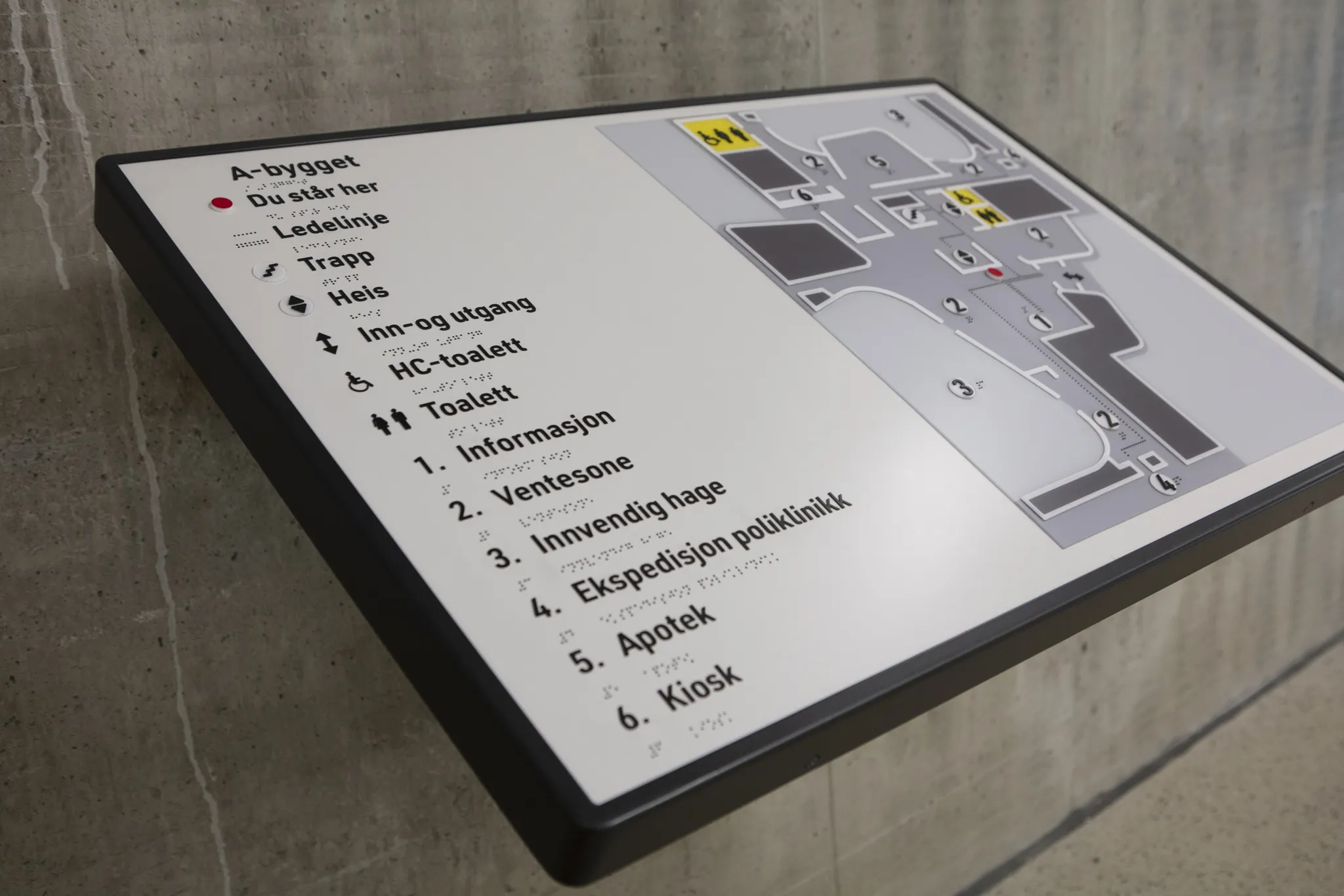 - Universell utforming: Alt skal kunne leses, forstås og nås av alle, uavhengig av funksjonsevne. Trengs det ledelinjer og punktskrift? Hvor skal de plasseres? Hva med luminans? Er det god nok kontrast mellom skiltinformasjon og omgivelsene? Regelverket er strengt og setter mange krav for å gjøre et bygg tilgjengelig for alle.